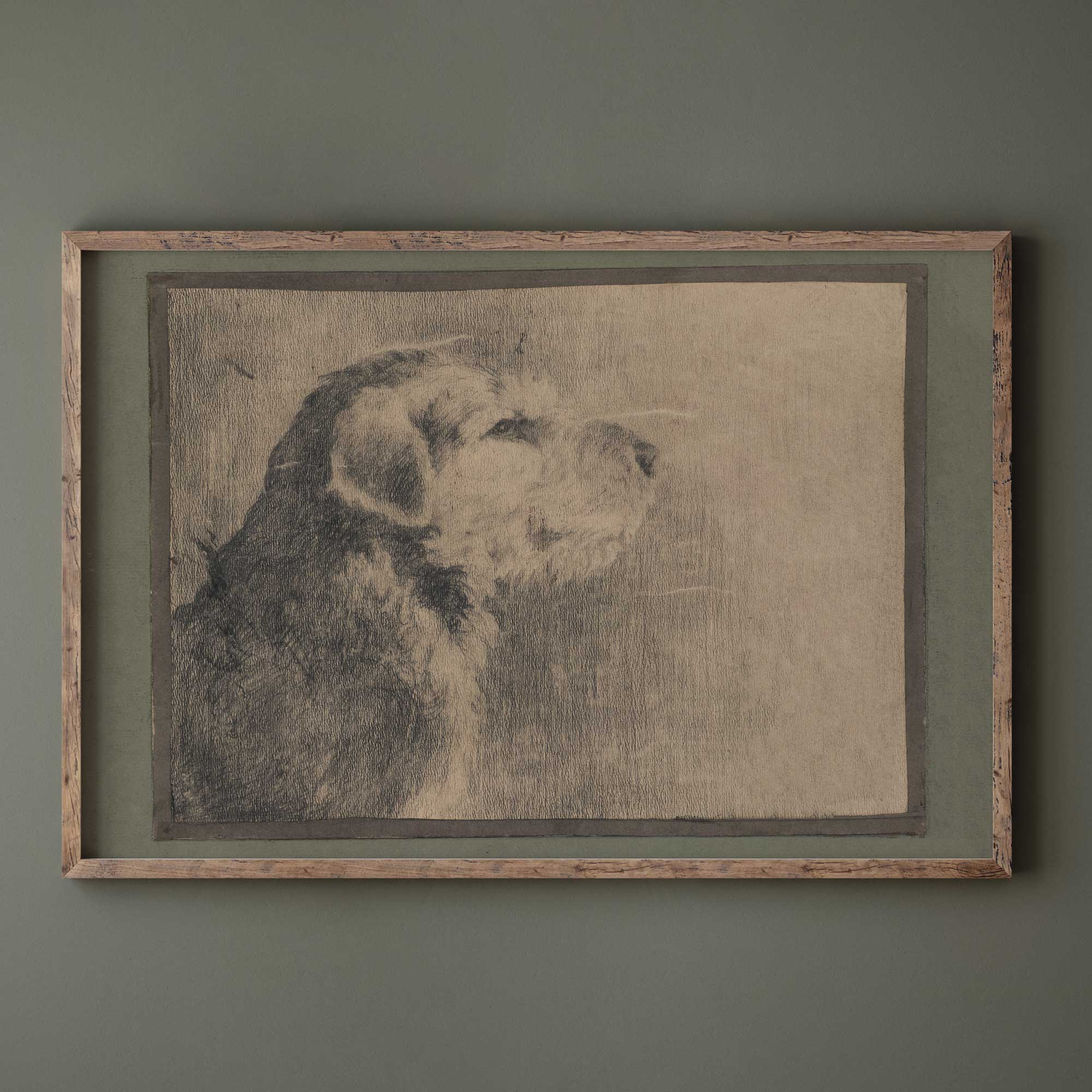 This art print features a detailed pencil sketch of a dog in profile, reproduced from an antique drawing. It highlights the animal’s calm, attentive expression and adds rustic, timeless charm to any wall.
