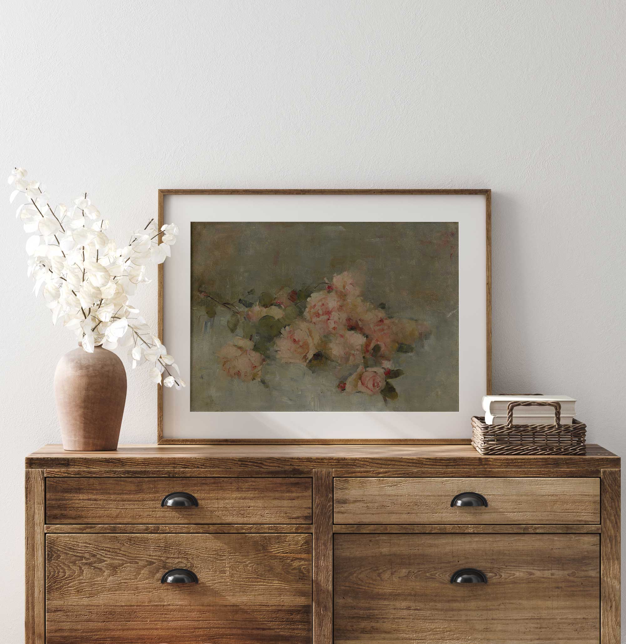 Pastel Roses Print: A vintage-style print featuring a soft cluster of pastel roses in muted pink and cream, set against a subdued green background for a gentle, serene atmosphere.
